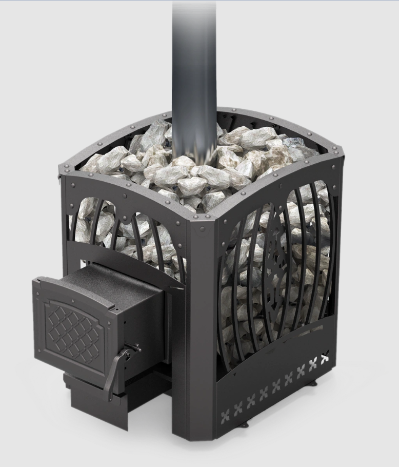 Вместительная каменка способна вместить до 150 кг камней. Глубина топки позволяет использовать дрова длиной до 39 см, обеспечивая длительное и равномерное горение топлива.