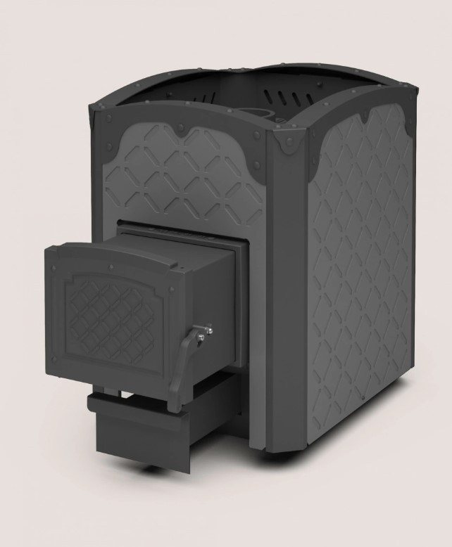 Толщина корпуса чугунной топки составляет 10мм и изготавливается из серого чугуна по ГОСТ 1412-85. Глубокая топка позволяет использовать дрова длиной до 430 мм. Внешняя каменка помещает в себя 60кг камней. Округлая форма самой топки сконструирована так, чтобы прогревать весь объем каменной закладки без застойных «холодных» зон. Большой количество ребер чугунной топки обеспечивает эффективный теплообмен.
