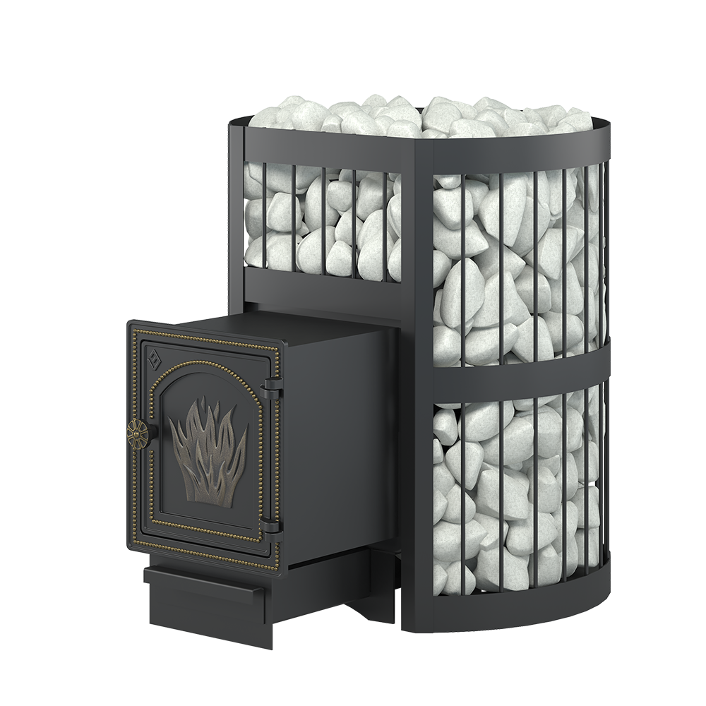 Банная чугунная печь Везувий Легенда Стандарт 22 ДТ-4 - печь для парной с объемом от 12 до 24 м.куб. укомплектована топочной глухой чугунной дверцей и конвекционно-вентилируемым кожухом изготовленным из калиброванного прута диаметр 6 мм. Печь-сетка с большой загрузкой камней, выносная топка позволяет протапливать печь из соседнего с парной помещения. Большая масса камней надолго сохраняет тепло после угасания огня в топке печи, также камни экранируют инфракрасное излучение исходящее от раскаленной топки печи.