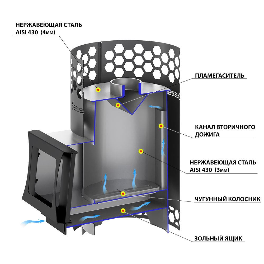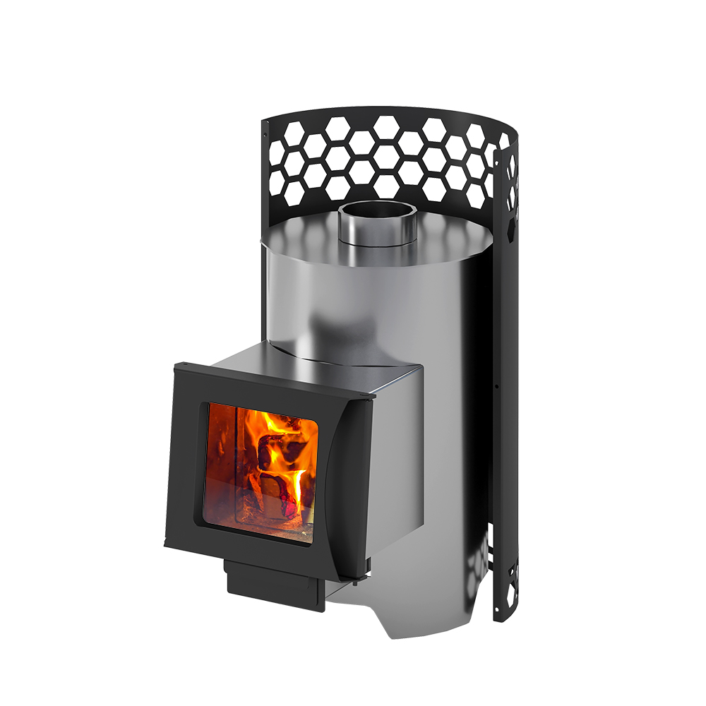 Печь сделана из нержавеющей стали AISI 430 с толщиной стенок от 3 до 4 мм. Дизайн корпуса печи выполнен в виде сот. Диаметр дымохода 115 мм. Дверка имеет правое и левое открытие. Улучшенная загрузка дров благодаря расположению двери под углом. Печи представлены как со стеклом, так и без него. Так же есть возможность дополнить печь баком на 50 литров, подиумом высотой в 70 мм и фронтальным экраном.