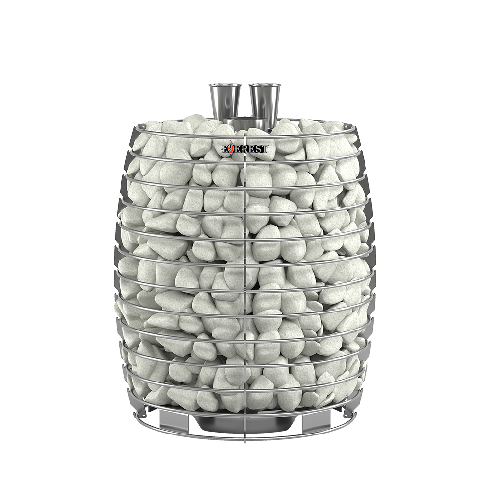 Печь изготовлена из нержавеющей стали AISI 430 c толщиной элементов от 4 до 24 мм в зависимости от участка. Мощностью 24 кВт, она с легкостью прогреет парную от 12 до 24 кубических метров. Усиленная кольцевая сетка конвектор так же сделанная из нержавеющей стали, прекрасно подчеркивает стиль и дизайн печи. В неё помещается около 140 – 200 кг камней в зависимости от их вида, плотности укладки и фракции.