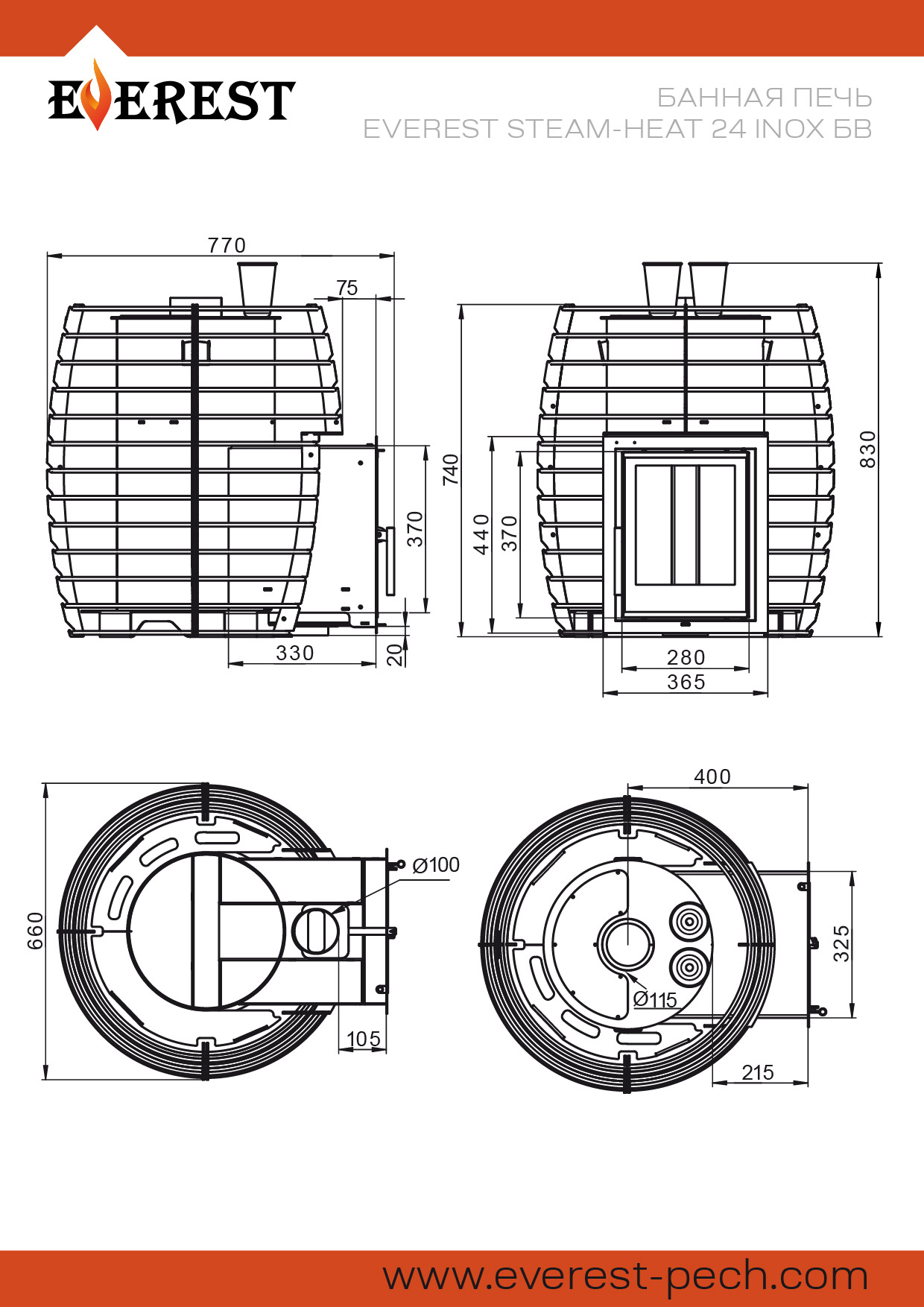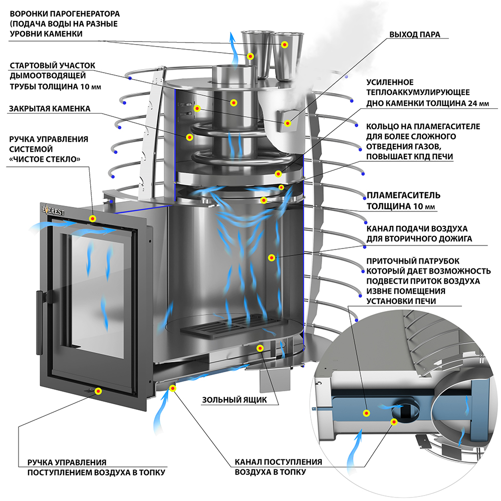 Нержавеющая сталь толщиной 24 мм, интегрированная каминная дверка, системы чистое стекло, вторичный дожиг, неповторимый дизайн и звук вьюги. Всё это - про новую печь для бани Эверест Steam-Нeat 24 INOX.
