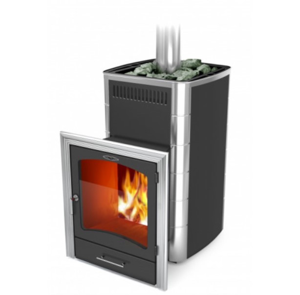 Она сочетает в себе мощную банную печь и большой красивый камин. Лабиринтный газоход обеспечивает мощный скоростной нагрев парилки объемом до 30 м3 и качественный прогрев каменной закладки массой около 100 кг.
