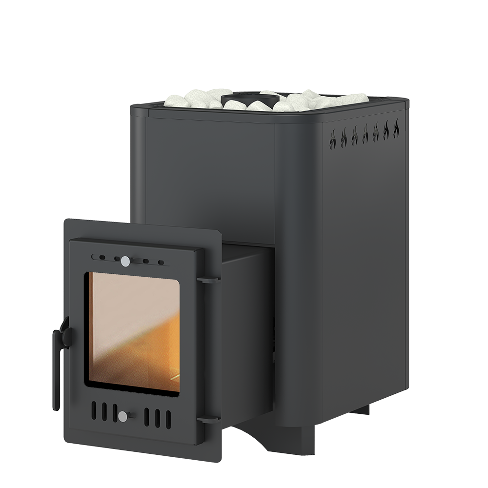 Стальной кожух печи зафиксирован на корпусе, для улучшения конвекции оснащён прорезными отверстиями в верхней части. Внутренние вырезы обеспечивают попадание холодного воздуха к камням, наружные – нагрев воздуха в парной.