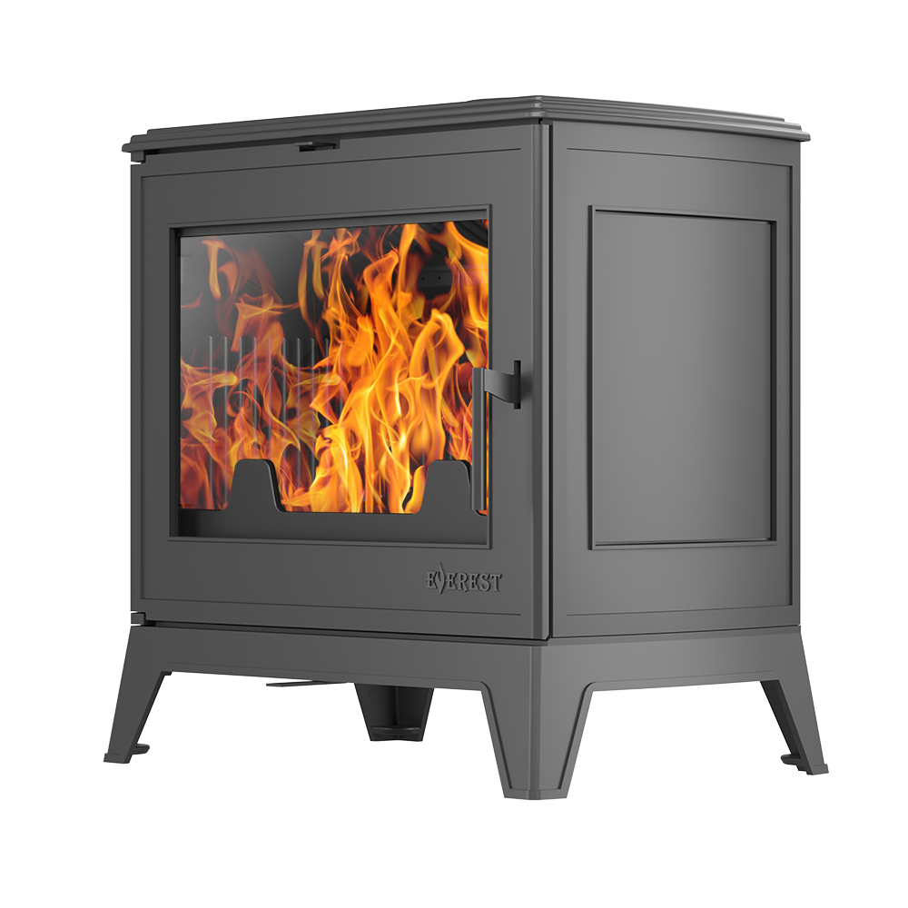 Печь-камин EVEREST Н16 изготовлена из качественного жаростойкого чугуна с толщиной стенок 6-8 мм. Модель рассчитана на обогрев помещений объёмом до 320м³. Печь-камин имеет пламегаситель изготовлен из жаростойкого чугуна (ГОСТ 1412-85). Топка печи-камина усилена чугунными вставками с системой трёхуровневый вторичного дожига. С помощью этой функции по каналам подачи вторичного воздуха поступает воздух, который нагревается при прохождении между топочной камерой и стенками корпуса. Далее нагретый воздух через дефлектор поступает в топку, перемешивается с газами - продуктами горения, чем вызывает повторное возгорание. Регулировка этой системы, как и подача воздуха в колосниковую зону, осуществляется рычагом, расположенным в нижней части печи-камина. В верхней части над топочной дверью расположена ручка регулировки системы чистое стекло, которая препятствует оседанию сажи на внутреннюю поверхность стекла. Патрубок дымохода Ø 150мм – универсальный, со сменным положением. Он может быть установлен сверху или сзади в зависимости от размещения печи в помещении.