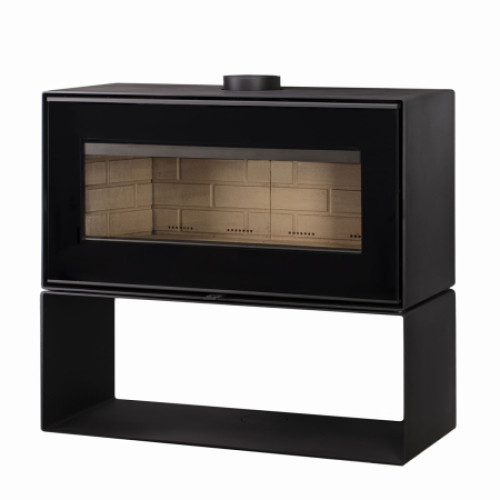 Печь-камин Монблан AOT 10.0.05 сочетает в себе элегантный внешний вид и высокую функциональность. Цельностеклянная передняя панель с панорамным остеклением (1000×520 мм) обеспечивает потрясающий вид на пламя, а черный принт по контуру стекла добавляет стиля.