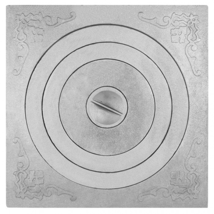 Чугунная плита под казан на 8 - 10 литров, имеет рельефный рисунок, восточный орнамент, размер плиты 512х512мм, толщина от 12 до 20 мм. В целях повышения прочности с обратной стороны плита имеет ребра жесткости, препятствующие деформации при воздействии высоких температур.