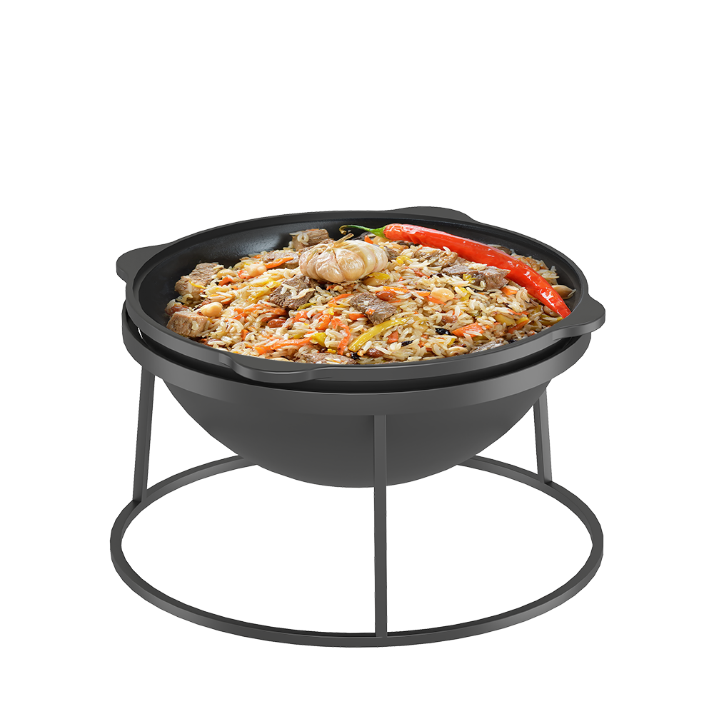 Подставку устанавливают в центр гриля над огнём, в верхнее кольцо встаёт казан 8 или 12 литров, сковорода или решётка.