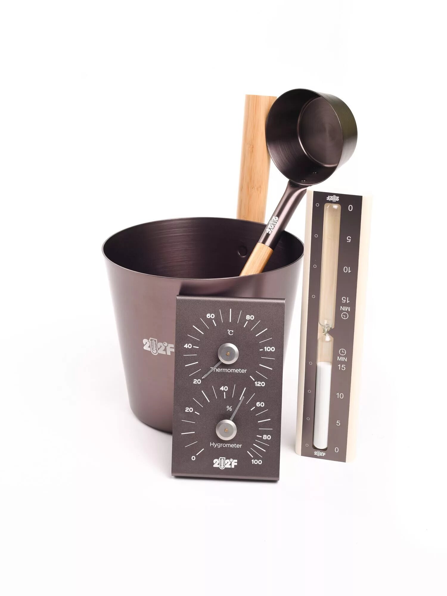Набор OXY-M-4 BLACK Ушат 5л + черпак 0,2л + песочные часы + термогигрометр выполнен из анодированного алюминия черного цвета толщиной 2мм.